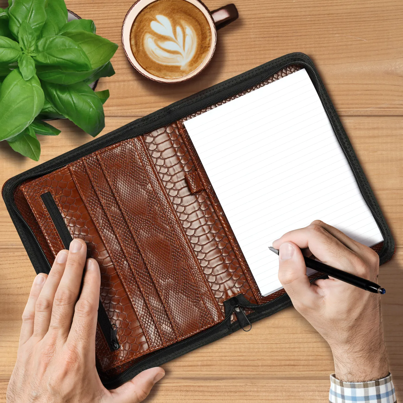 Croco brown folder has 1 large space for storage, 1 zipper compartment and room for 6 business cards.